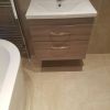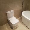 Modern square effect toilet and wall hung vanity basin with modern tap and bath shower mixer.